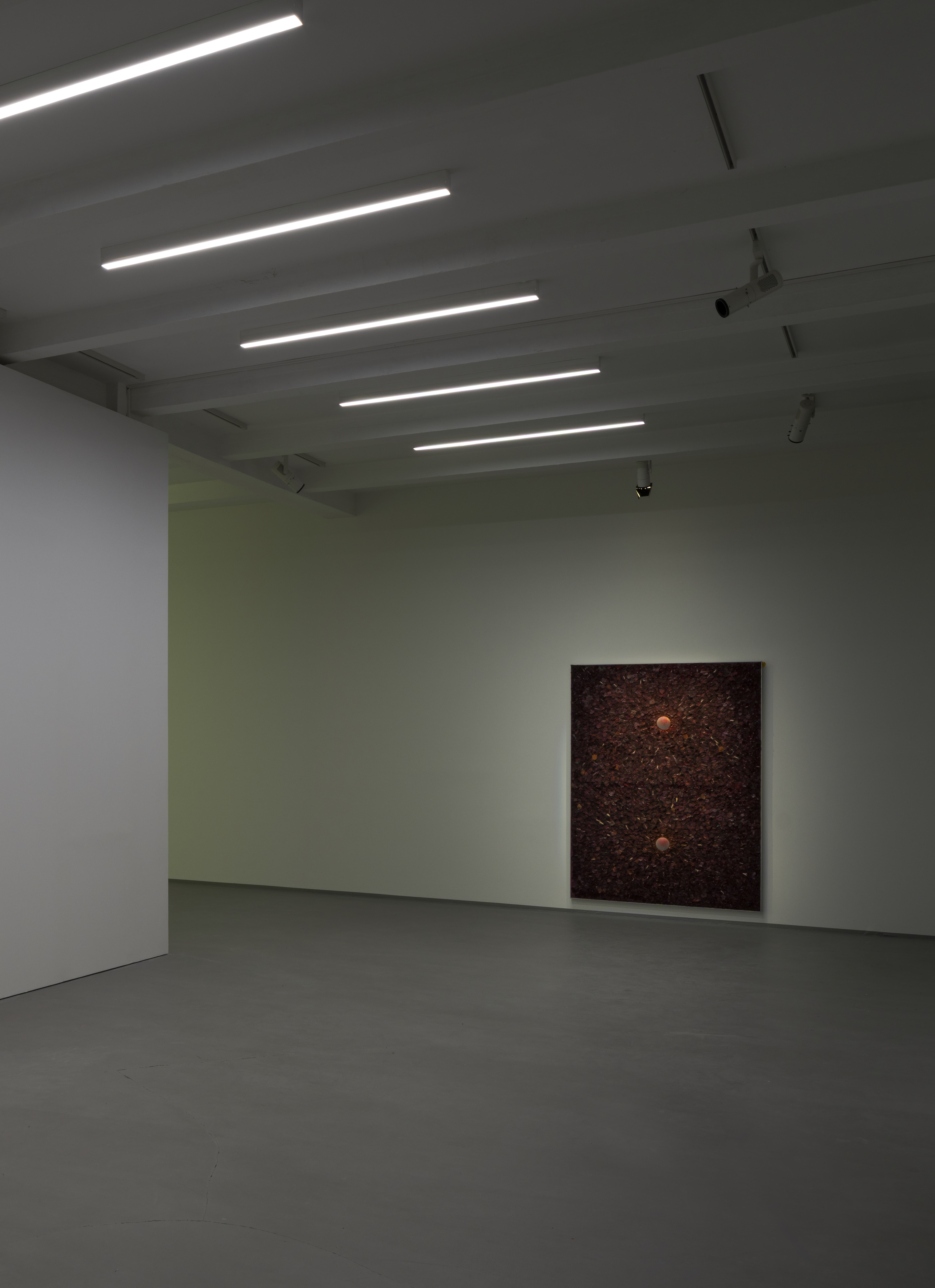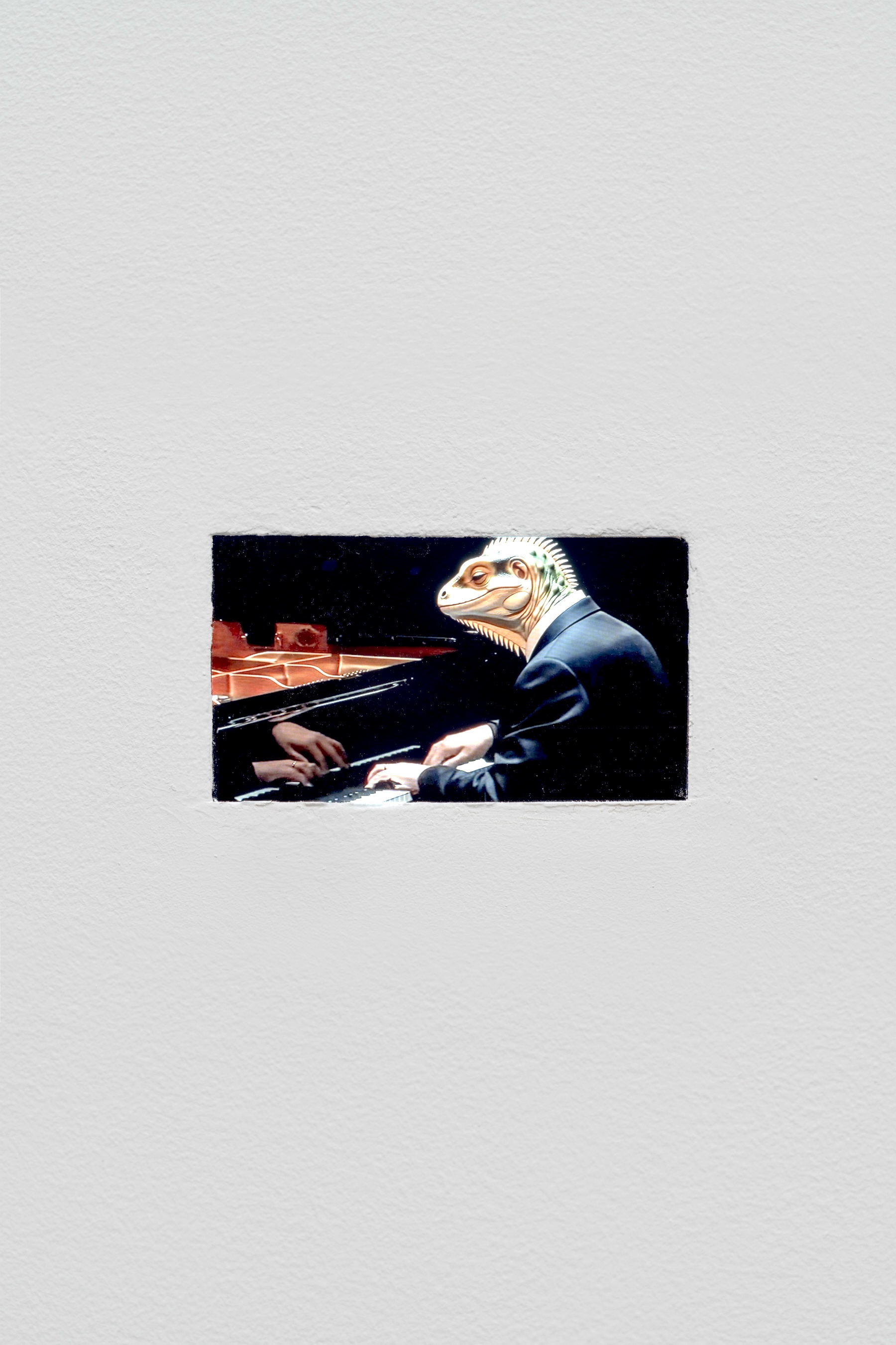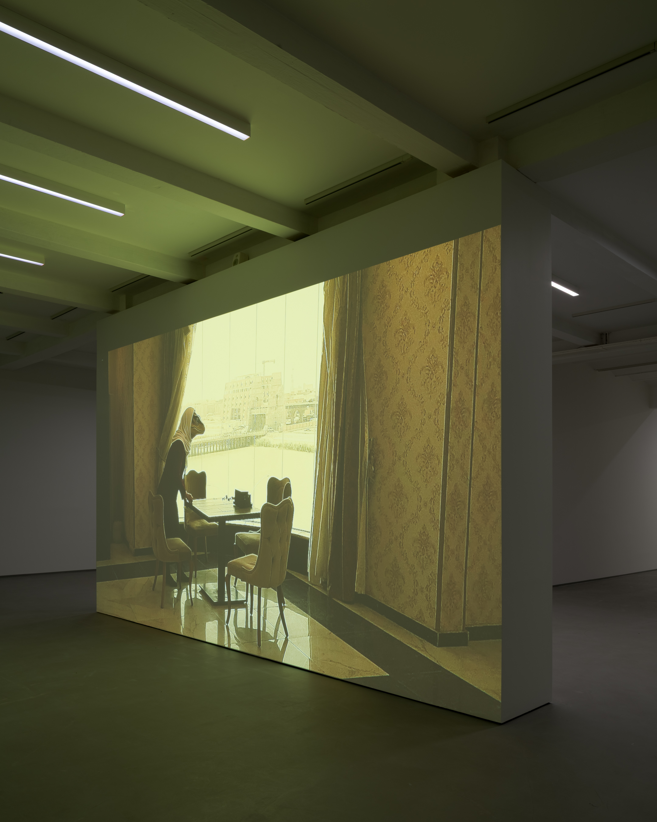 Kamil Dossar’s artistic output—films, paintings, and collages—builds chains of association often employing pop cultural references, animation, and avatars to ponder systemic images of migration, state craft, and outcast, invisible identities. For his first large-scale solo show, Dossar has created a suite of new works toying with Western cultural codes—not unlike the Fahrenheit measuring scale or the mathematical order of Johann Sebastian Bach’s classical compositions—and their potential alienating effects. Entering the exhibition, a tiny screen plays a recent recording of a Bach piano concert. Creating a custom-designed script using “deep fake” AI technology, the musician is turned reptile—a generic rendering of a monster. The twisted, monstrous visuals of the piano recording hint at how classical music, despite its apparent benevolence, as a core pillar in Western culture is also part of a history that throws long shadows of colonial oppression and demands for assimilation. During his Danish upbringing, Dossar watched his late father, a political refugee from Iraq, studying Bach in his futile efforts to find solace in Europe. Following Bach’s music into the second space, the piece’s counterpart, a large-scale projection, shows post-war Iraq cityscapes filmed by the artist—including images of a café where lights oscillate due to occasional power outages—as if constructing an arena for the concert. Just like the pianist, the locals in these scenes are transformed into reptilian creatures. Thus Dossar accelerates the very mechanism of collective, paranoid “othering”— pushing the image of monstrosity so far that it begins to undermine itself. We watch the reptilians’ gentle, human movements in the heart of everyday life, overwriting their immediate appearance. A reptilian waiter passes by, her hand sliding in a seamless gesture, carefree.